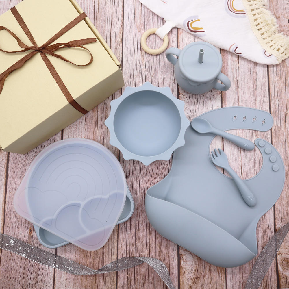 It includes a Baby Bib, 3-in-1 anti-spill easy-to-hold Sippy Cup, Suction Feeding Bowl, Suction Dinner Plate with Lid, Spoon and Fork with rounded, smooth edges to ensure safety.